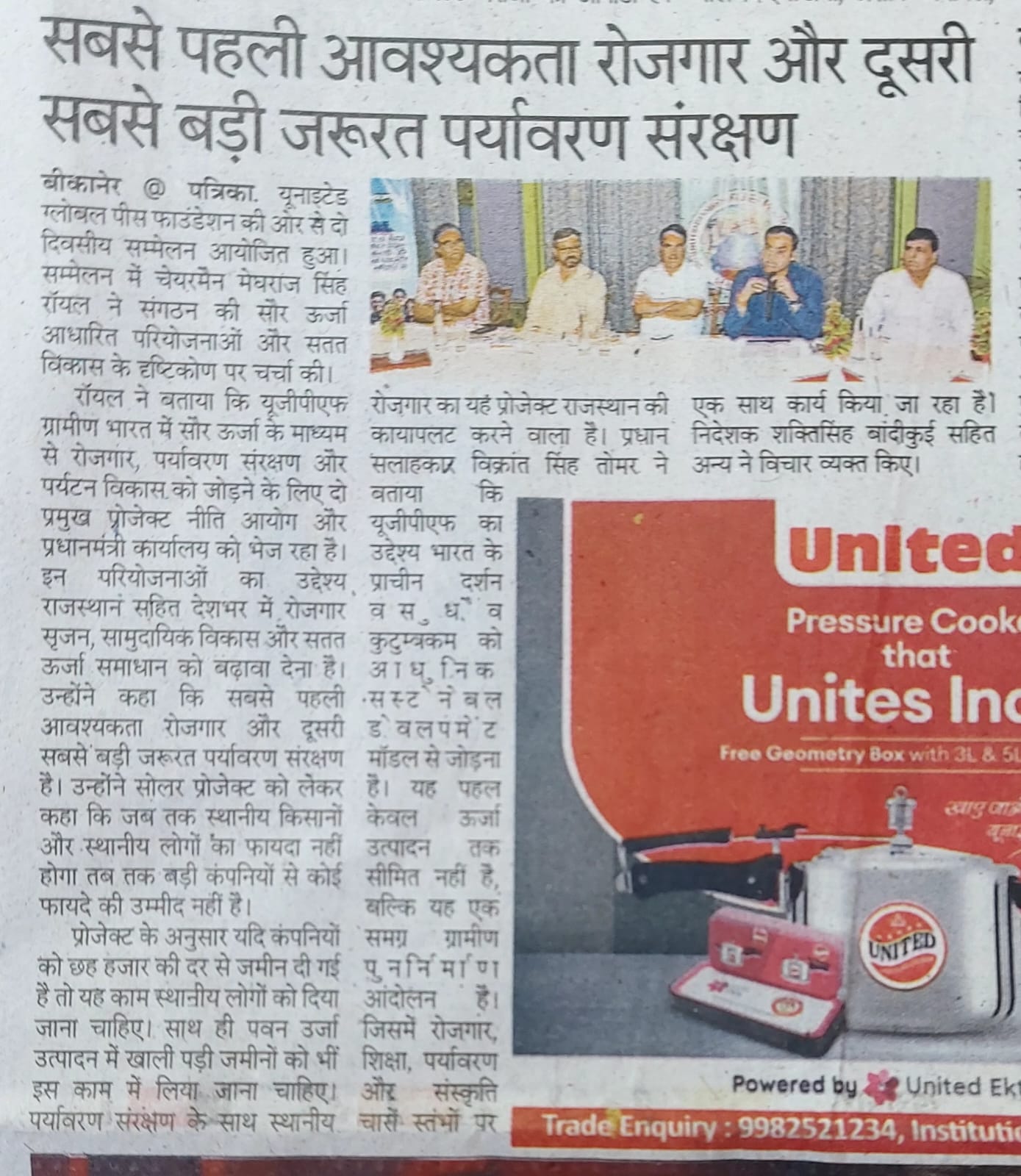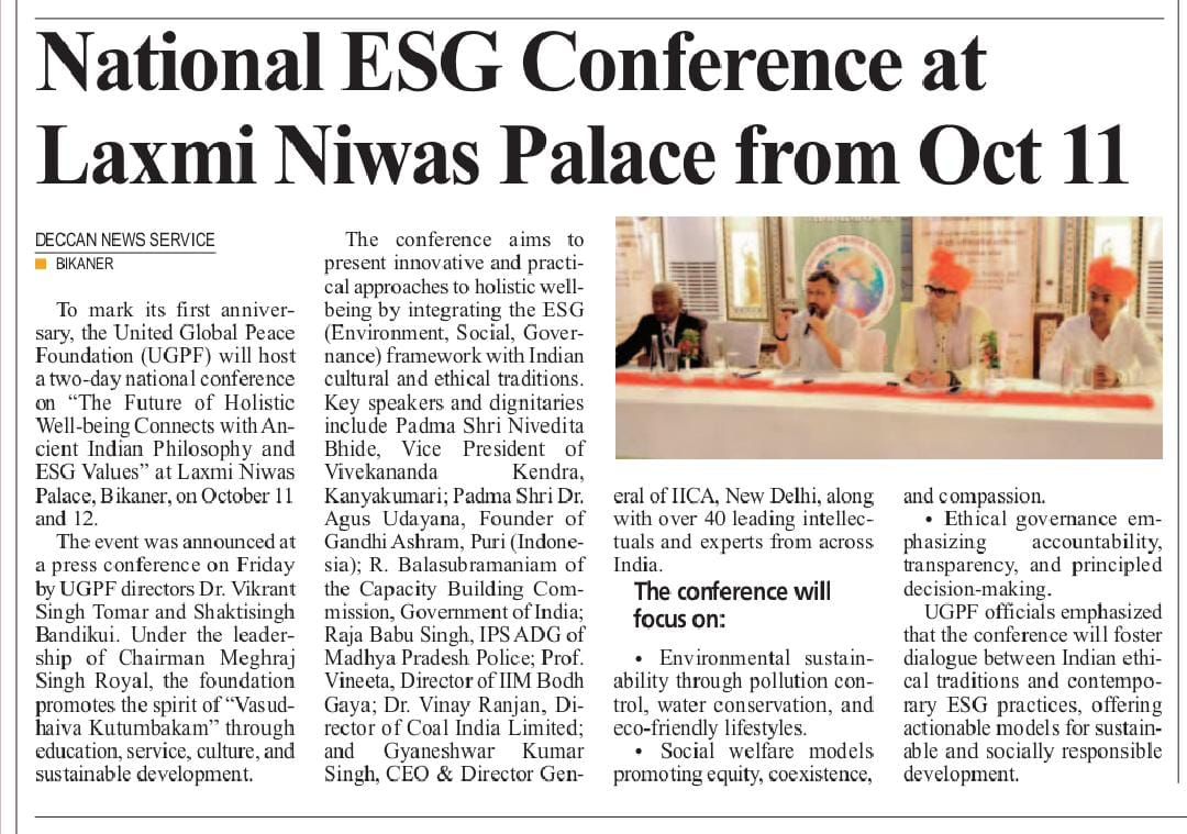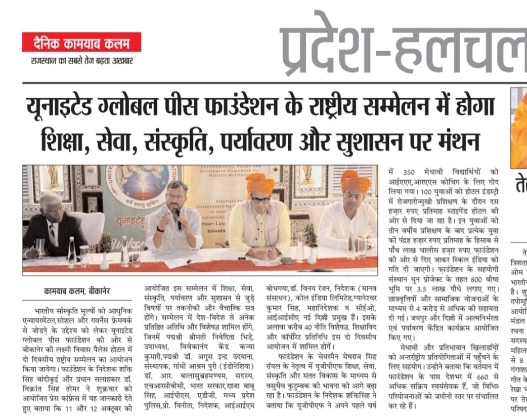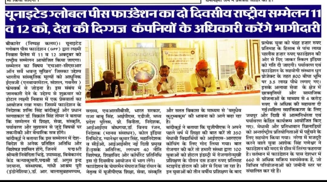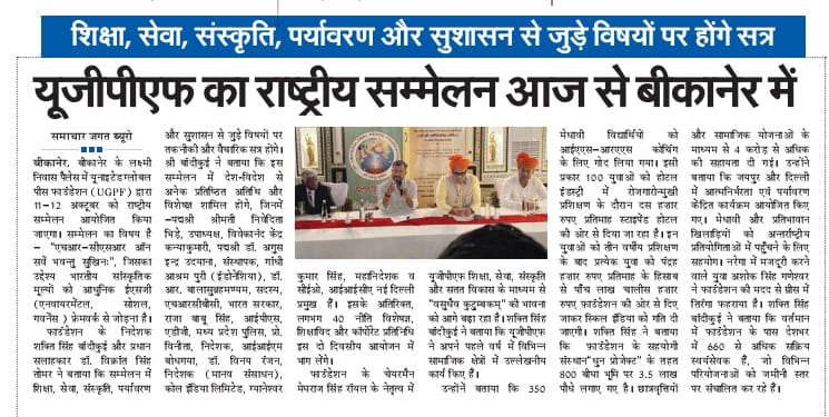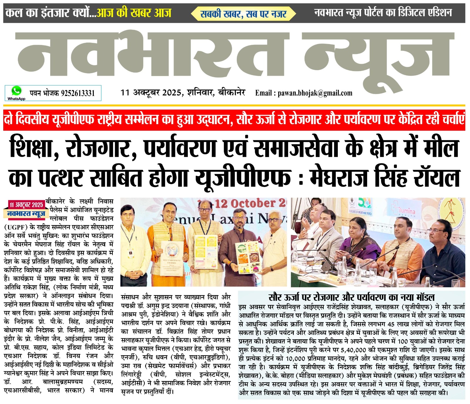 Bikaner. A grand two-day “National Conference on Sarve Bhavantu Sukhinah” was organized by the United Global Peace Foundation (UGPF) on 11–12 October 2025 at Laxmi Niwas Palace, Bikaner. The conference witnessed in-depth discussions on governance, sustainable development, rural employment, solar energy, ethical economy, youth skills, and global responsibility.