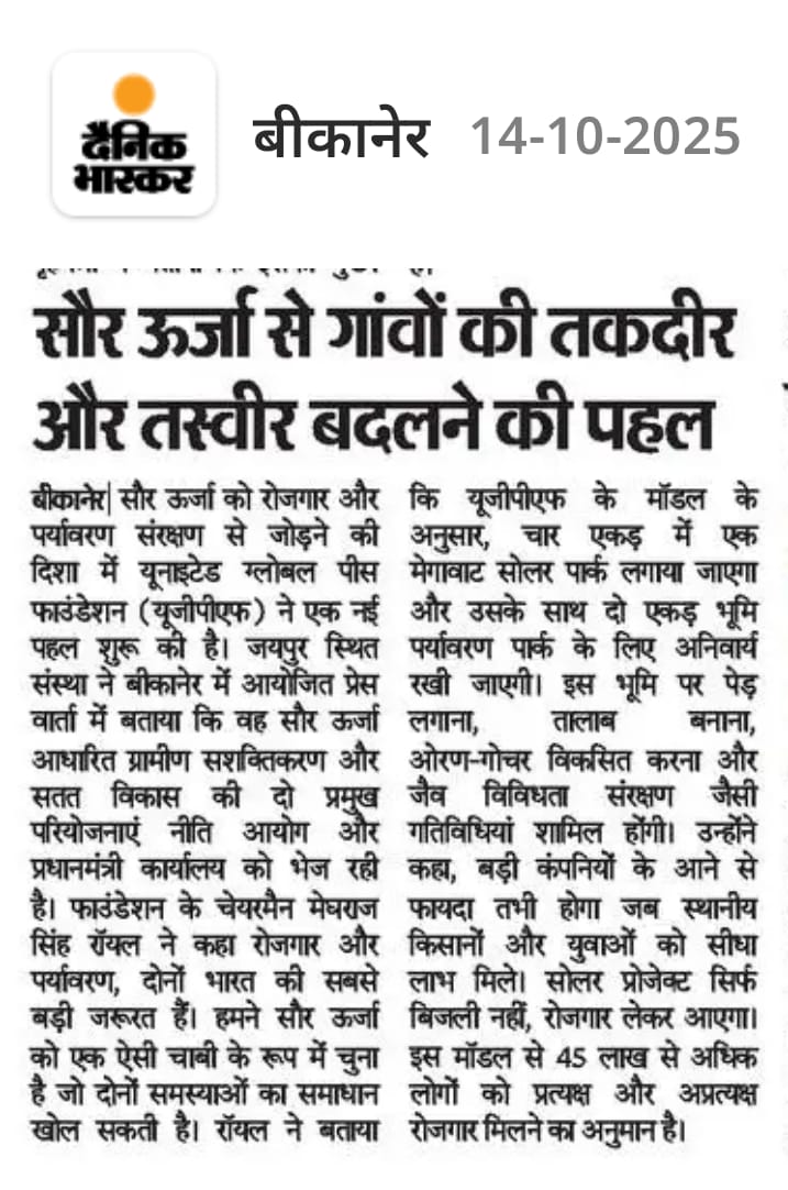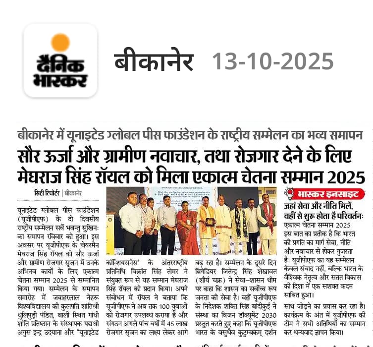 UGPF Chairman Meghraj Singh Royal was conferred with the “Ekatma Chetna Samman 2025” for his outstanding contributions toward rural empowerment, solar energy–based green economy model, and employment generation.